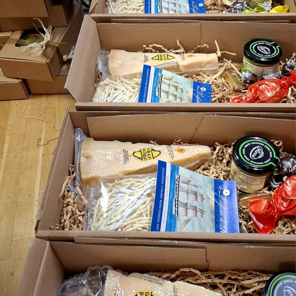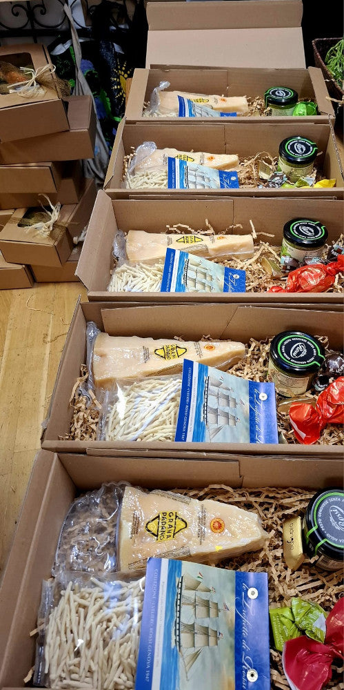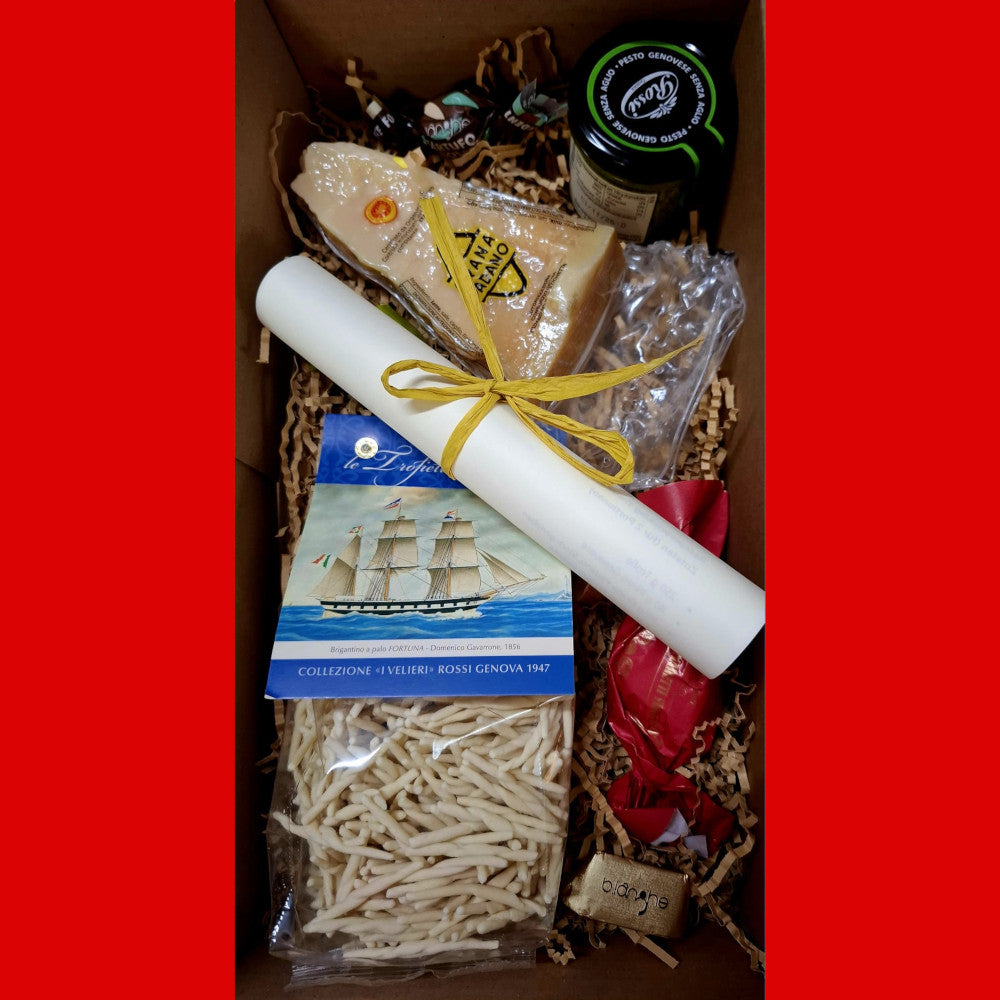 2er Präsentkarton "Zeit zum Geniessen" gefüllt mit: 300 gr. ca. Grana Padano Käse, 250 gr. Trofie-Pasta, 85 gr. Pesto Genovese ohne Knoblauch, Schokotrüffel, Mandelkekse