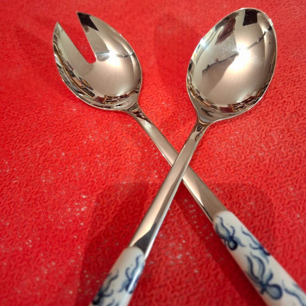 Besteck Löffel & Gabel für Salat & Pasta - L. ca. cm. 26 - Motiv Kleine Tintenfische Farbe Blau