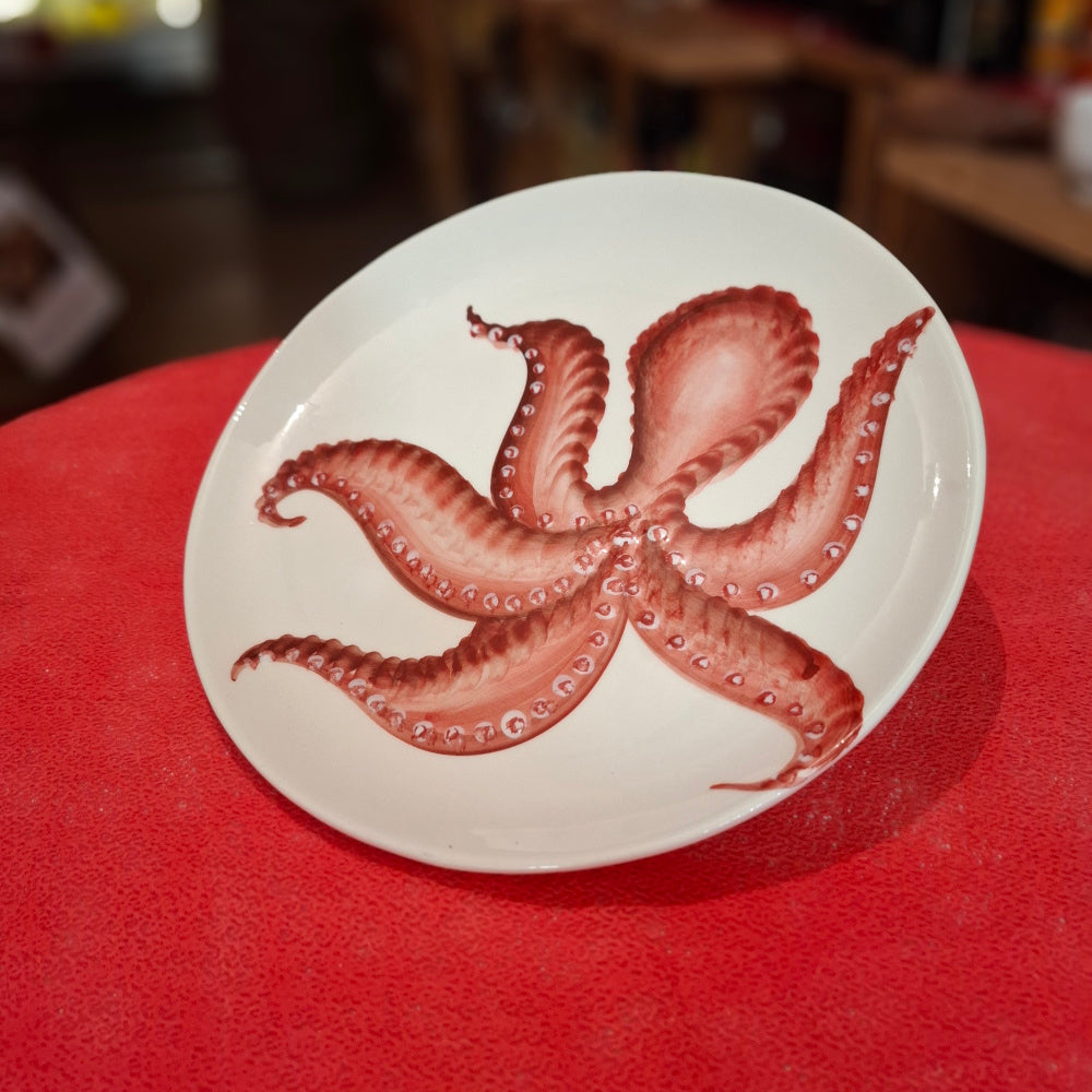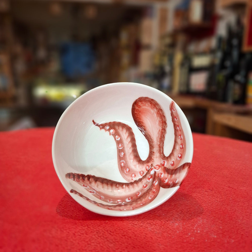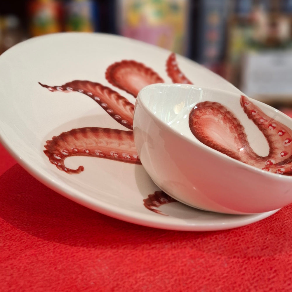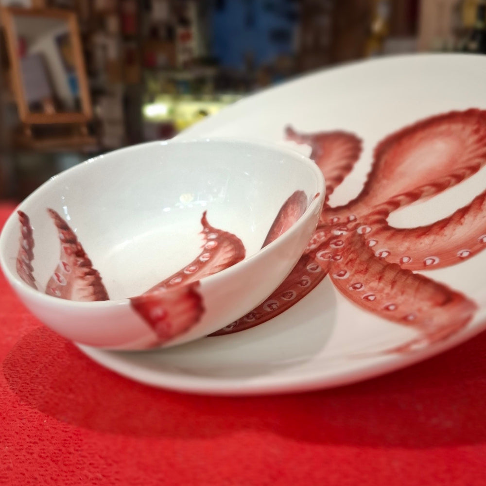 Keramik Set Teller+ Schüßel Motiv Oktopuss Farbe Cottorot - Handarbeit aus Italien
