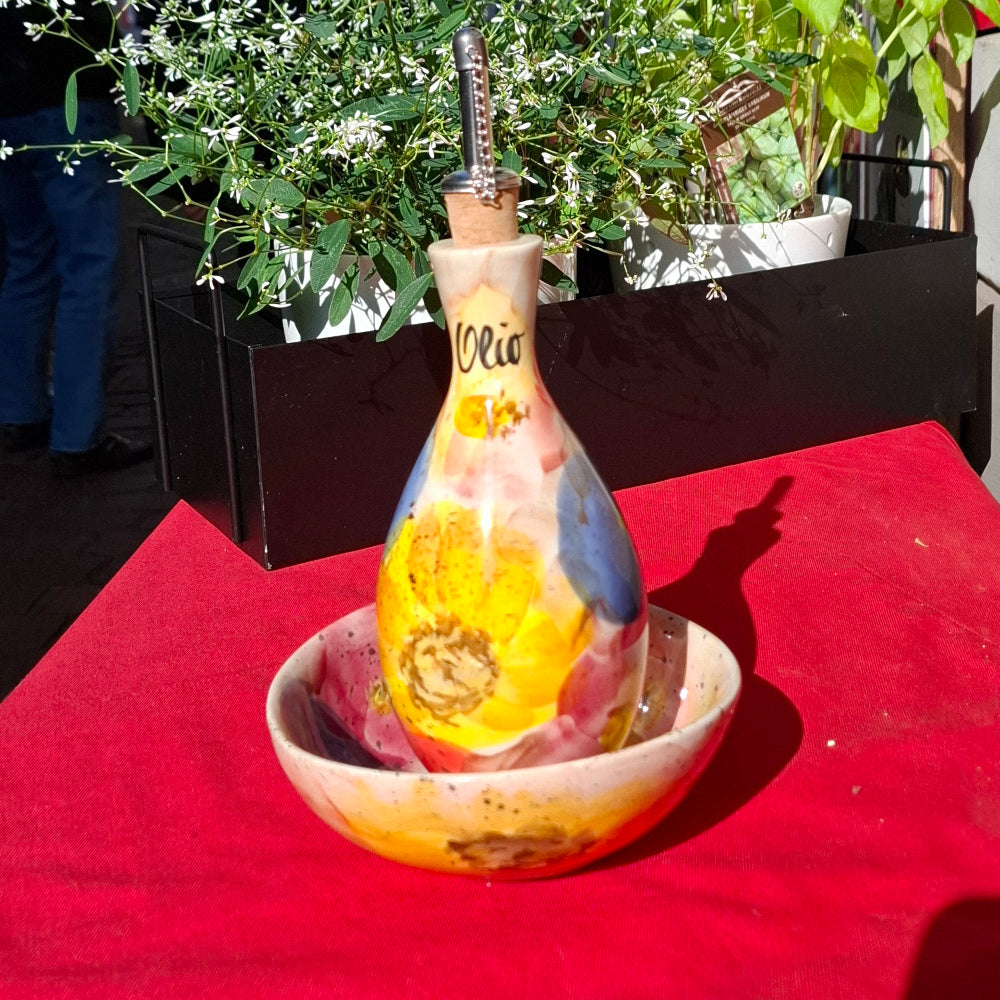 Ein Eyecatcher für jeden Tisch: die handgefertigte & handbemalte Keramik Fl. für Öl mit Außgieser ( H. 18 cm.ca. 1.25 lt. ) + 1 Schale ( B.14 cm. H. 5/6 cm. ) Design Mix Flower- in Keramiknvereint Ästhetik & Funktionalität.