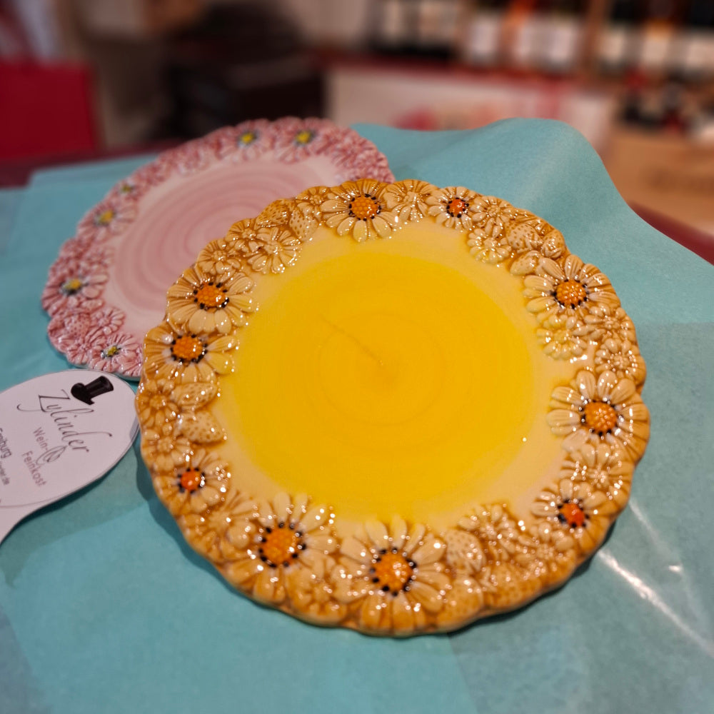 Ein Eyecatcher für jeden Tisch: die handgefertigte & handbemalte Keramik Teller 1 x Gelb und 1 x Rosaantico mit Margheritedekorand ( B. cm. ca. 22 H cm. ca. 1,5 ) in Keramiknvereint Ästhetik & Funktionalität.