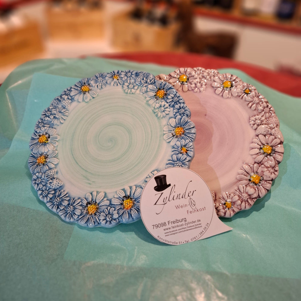 Ein Eyecatcher für jeden Tisch: die handgefertigte & handbemalte Keramik Teller 1 x Azzurro und 1 x Helllilla mit Margheritedekorand ( B. cm. ca. 22 H cm. ca. 1,5 ) in Keramiknvereint Ästhetik & Funktionalität.